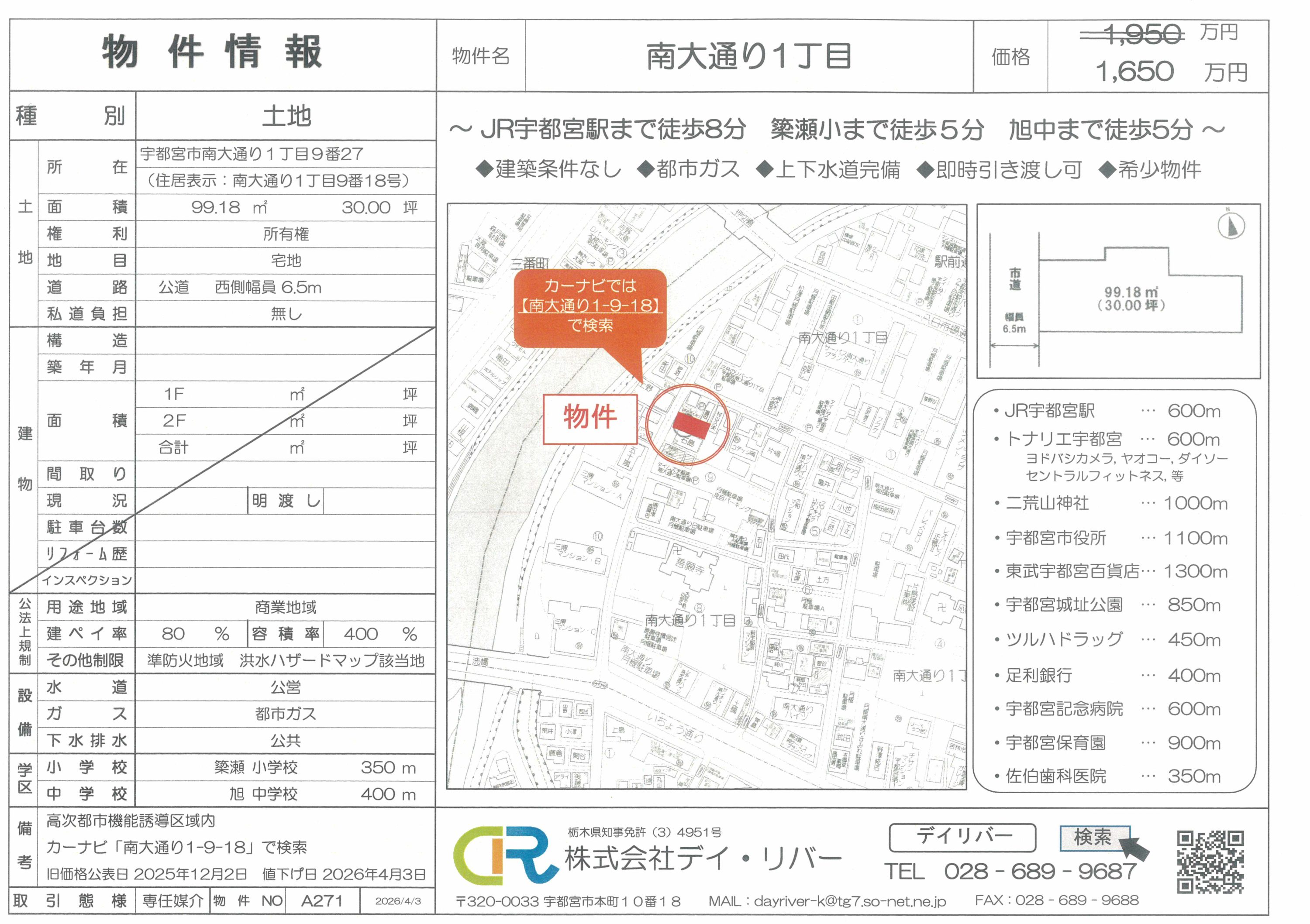 | 物件名 | 南大通り1丁目 | 住所 | 宇都宮市南大通り1丁目9番27 |