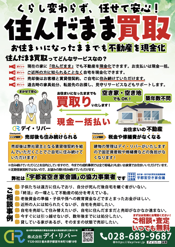 2017年9月から始まりました、お客様がお住まいになったまま不動産を現金化できる『住んだまま買取り』、大変ご好評いただいております。引き続き弊社と致しましては、この『住んだまま買取り』事業を地域の皆様のご要望に合う様に取り組んで参りたいと考えております。下記のようなことでお困りがございましたら、是非とも弊社自信の『住んだまま買取り』をご検討くださいますようお願い致します。