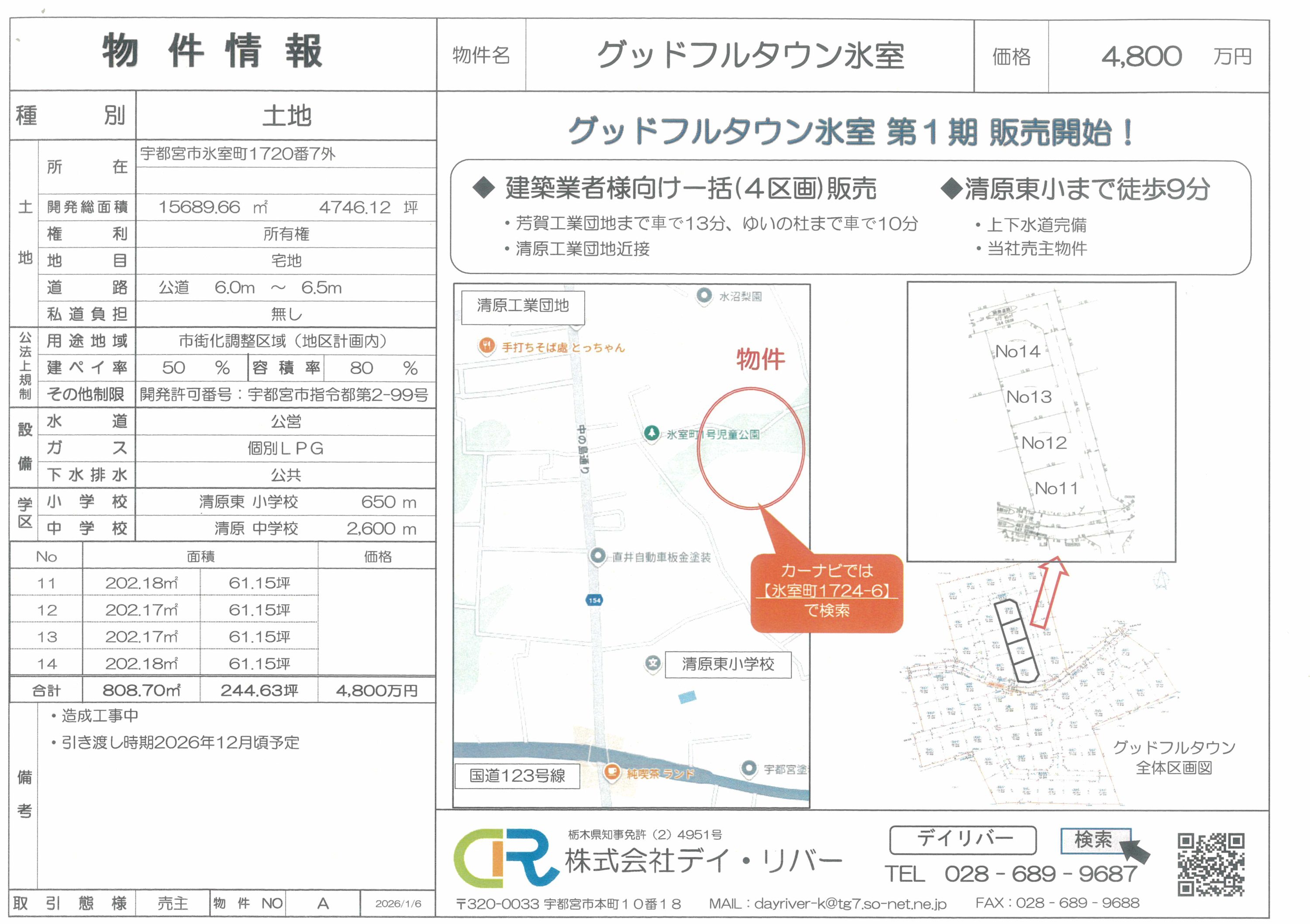 | 物件名 | グッドフルタウン氷室 4区画(No11~14)一括販売 | 住所 | 宇都宮市氷室町1720番7 |